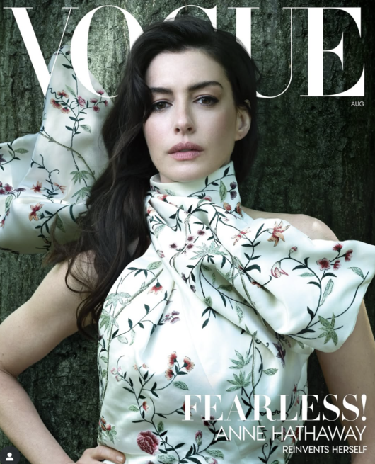 공개된 커버 속 앤 해서웨이는 화이트 하이넥 톱에 화려한 플로럴 자수가 장식된 의상을 입고 포즈를 취했다.