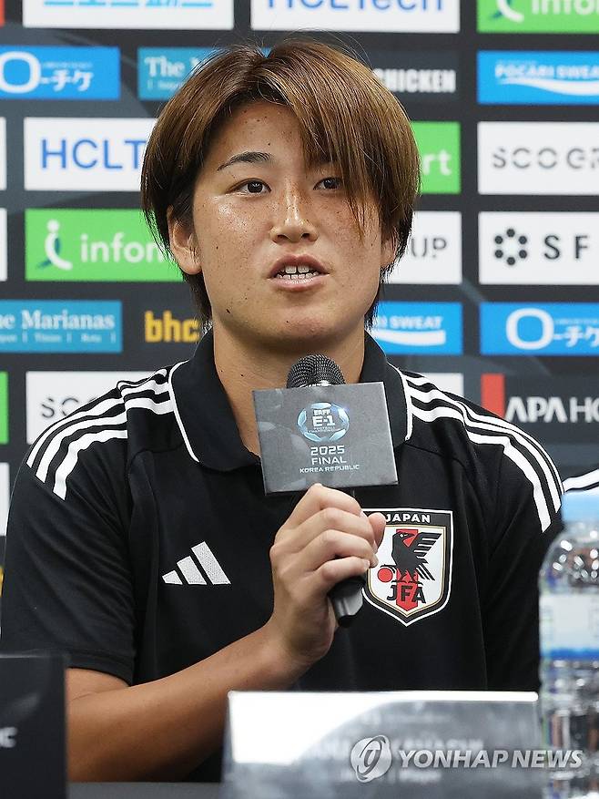 (용인=연합뉴스) 홍기원 기자 = 8일 경기도 용인미르스타디움에서 열린 2025년 동아시아축구연맹(EAFF) E-1 챔피언십(동아시안컵) 여자부 공식 기자회견에서 일본 하나 다카하시가 취재진 질문에 답하고 있다. 2025.7.8