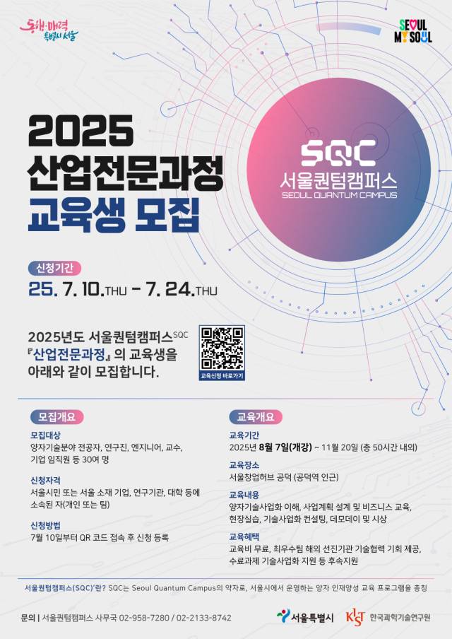 서울시는 한국과학기술연구원(KIST)과 양자과학기술 교육 과정인 서울퀀텀캠퍼스(SQC)의 '산업전문과정' 2기 교육생을 10일부터 24일까지 모집한다고 8일 밝혔다.