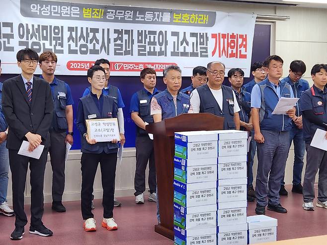 민주노총 경남본부는 "다시 되풀이되지 않도록 고성군에서 발생한 악성민원 범죄행위에 대한 철저한 수사와 처벌이 요구한다"라며 "공무원을 포함한 고객 응대를 수행하는 노동자들이 악성민원인으로부터 보호받을 수 있도록 사업주의 의무를 강화해야 한다"라고 강조했다.