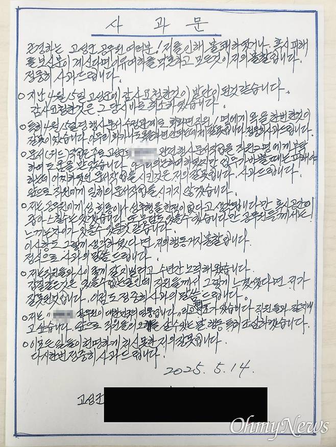 한편 ㄱ씨는 지난 5월 14일 공무원노조 고성군지부를 방문해 사과문을 제출했고, 이후 단체 회장직에서 사퇴했다.