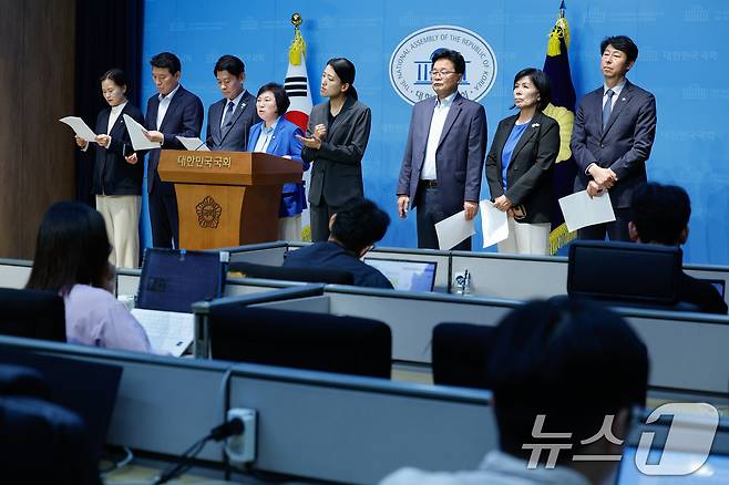 (서울=뉴스1) 안은나 기자 = 국회 과학기술정보방송통신위원회 소속 더불어민주당, 조국혁신당 의원들이 8일 오후 서울 여의도 국회 소통관에서 이진숙 방송통신위원장에 대한 감사원 감사결과 관련 이 위원장의 자진 사퇴를 촉구하며 기자회견을 하고 있다. 왼쪽부터 이해민, 조인철, 한민수, 김현, 김우영, 최민희, 이훈기. 감사원은 이 위원장의 "민주당이나 좌파집단은 우리가 상상할 수 있는 모든 것을 하는 집단"이라는 과거 유튜브 발언 관련 정치적 중립 의무를 위반했다며 '주의' 처분을 내렸다. 2025.7.8/뉴스1