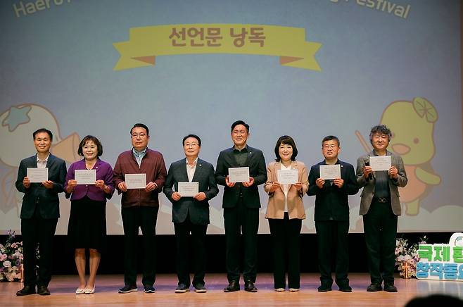 | ▲ 환경동요제 선언문 시·도의원을 비롯한 내빈들이 환경 보호의 가치와 동요의 중요함을 담은 ‘환경동요제 선언문’을 낭독하며 막을 열었다. 사진 왼쪽부터 엄계용 시흥시 문화체육관광국장, 오인열 시흥시의회 의장, 이봉관·안돈의·이건섭·한지숙 시의원, 장대석 도의원, 이재환 시흥예총회장 |
