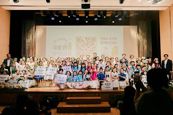 | ▲ 수상자 단체사진 시흥시가 주최하고 해로토로 국제 환경문화사업단이 주관한 행사엔 지역 정치인들과 시민들이 참석해 동요를 통한 환경 교육의 가치를 함께 공감했다. |