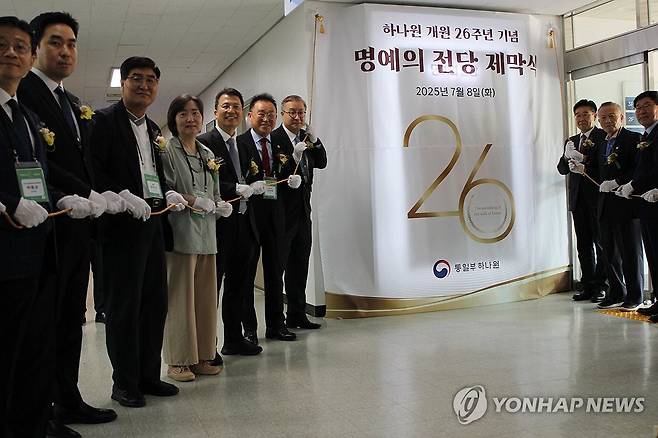 (서울=연합뉴스) 통일부 북한이탈주민정착지원사무소는 8일 개원 26주년을 기념해 기부자·봉사자 초청 행사를 열고 기부자 '명예의 전당'을 제막했다고 밝혔다. '명예의 전당' 제막행사 참석자들이 기념 촬영하고 있다. 2025.7.8 [통일부 제공. 재판매 및 DB 금지]