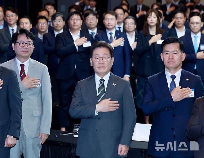 [서울=뉴시스] 최동준 기자 = 이재명 대통령이 8일 서울 용산구 그랜드 하얏트 서울에서 열린 제1회 방위산업의 날 토론회에서 이한주 국정기획위원장, 석종건 방위사업청장 등 참석자들과 국민의례를 하고 있다. (대통령실통신사진기자단) 2025.07.08. photocdj@newsis.com
