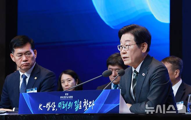 [서울=뉴시스] 최동준 기자 = 이재명 대통령이 8일 서울 용산구 그랜드 하얏트 서울에서 열린 제1회 방위산업의 날 토론회에서 발언하고 있다. (대통령실통신사진기자단) 2025.07.08. photocdj@newsis.com
