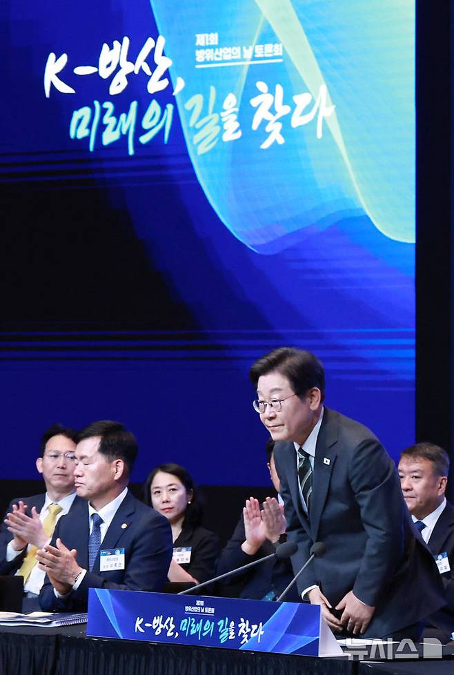 [서울=뉴시스] 최동준 기자 = 이재명 대통령이 8일 서울 용산구 그랜드 하얏트 서울에서 열린 제1회 방위산업의 날 토론회에서 인사하고 있다. (대통령실통신사진기자단) 2025.07.08. photocdj@newsis.com