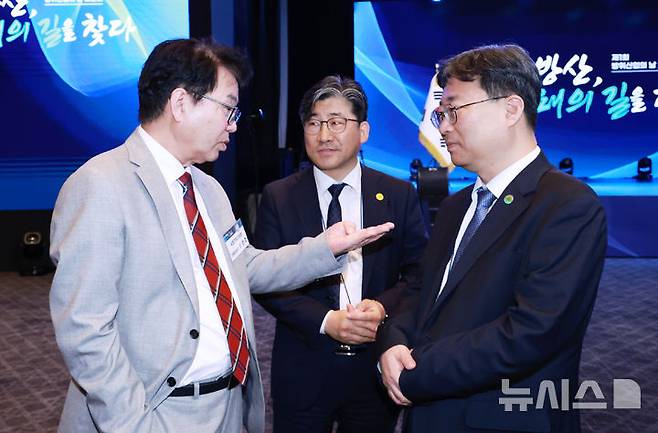 [서울=뉴시스] 최동준 기자 = 이한주(왼쪽부터) 국정기획위원장, 류덕현 대통령실 재정기획보좌관, 하준경 경제성장수석이 8일 서울 용산구 그랜드 하얏트 서울에서 열린 제1회 방위산업의 날 토론회에서 대화하고 있다. (대통령실통신사진기자단) 2025.07.08. photocdj@newsis.com