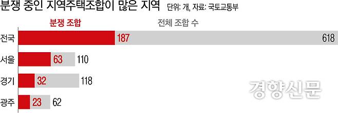 분쟁 중인 지역조합이 가장 많은 지역은 서울이었다. 서울 내 110개 지역주택조합 중 63곳(57.2%)이 분쟁을 겪고 있다. 다음으로는 경기(32곳·27.1%), 광주(23곳·37.1%)의 분쟁이 많았다.