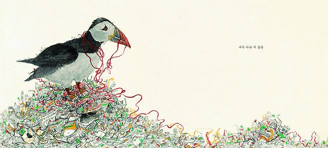 바다 동물들은 늘 먹던 대로 먹고, 놀던 대로 놀 뿐인데 어느 날부터 알록달록한 것들로부터 위해를 입기 시작한다. 이것들은 몸을 휘감고, 목을 조이고, 살갗을 뚫고 들어와 감당할 수 없는 고통을 만들어낸다. 그리하여 그들이 봉착한 위험한 세계를 이명애 작가는 한 장의 그림으로 보여준다. 새의 이름은 알지 못한다. 그러나 피 울음으로 가득 찬 것처럼 보이는 새의 붉은 눈동자를 나는 잊어버리지 못한다.