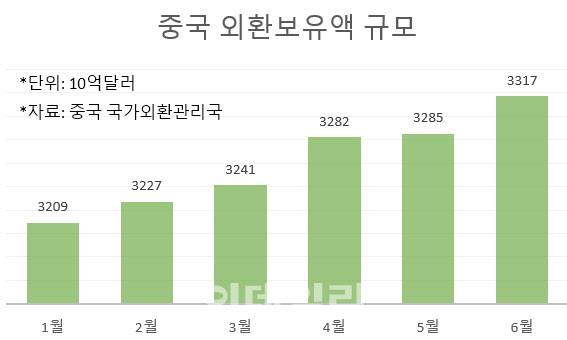 8일 중국 국가외환관리국에 따르면 6월말 기준 중국 외환 보유액 규모는 3조3174억달러(약 4539조원)로 전월대비 322억달러(약 44조원) 증가했다.