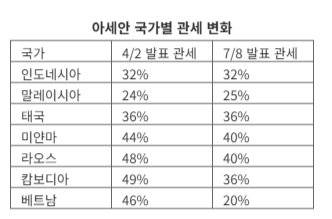 트럼프 대통령은 자신의 SNS를 통해 개별 개별 국가의 상호 관세율을 밝혔다. 트럼프 대통령은 △말레이시아(25%) △인도네시아(32%) △태국(36%) △캄보디아(36%) △미얀마(40%) △라오스(40%) 등 국가의 지도자들을 수취인으로 보낸 서한을 공개했다.