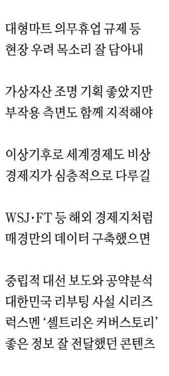 새 정부 출범에 맞춰 경제 분야를 비롯해 예상되는 정책 향방을 분석하는 기사가 돋보였다. 대형마트 의무휴업 제도와 같이 실효성을 다한 규제가 다시 강화할 수 있다는 우려 등 현장의 목소리를 충실히 담았다. 7년 이상 연체된 5000만원 이하 무담보 빚을 소각하는 '빚 탕감' 대책처럼 포퓰리즘 정책이 추진되는 상황이다. 국가 재정이 풍족하지 않은 상황에서 매경이 경계의 목소리를 좀 더 날카롭게 내야 한다.
