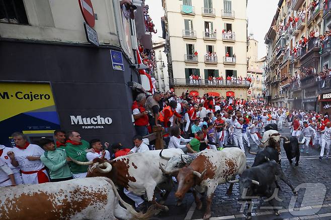 (팜플로나 로이터=뉴스1) 최종일 선임기자 = 8일(현지시간) 스페인 팜플로나에서 열린 '산 페르민 소몰이 축제'에서 참가자들이 질주하는 소들을 피하는 모습이다. 2025.07.08