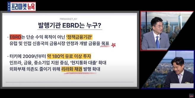 한경 글로벌TV의 경제 프로그램 '프리마켓 뉴욕'은 13일 방송을 통해 유럽부흥개발은행(EBRD)이 발행한 리라화 표시 채권 3종을 집중 조명했다. 해당 채권들은 모두 신용등급 AAA(Stable)를 유지하고 있으며, 환율 안정과 정책금리 고점 통과 국면이 겹치면서 환헤지를 하지 않아도 실질 수익률이 플러스로 전환되는 특징을 가진다.