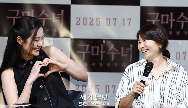 배우 스테파니 리(사진 왼쪽)와 김미숙이 8일 서울 용산 CGV에서 열린 영화 ’구마수녀-들러붙었구나’의 언론시사회에 참석해 대화를 나누고 있다.