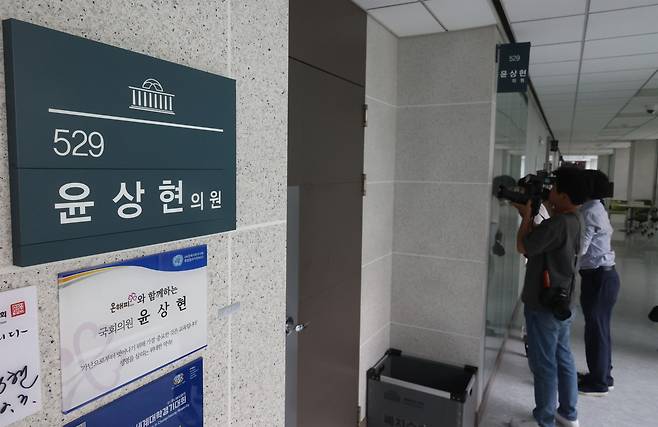 | ▲ 김건희 여사 관련 '공천개입 의혹'을 수사하는 민중기 특별검사팀이 윤상현 국민의힘 의원의 자택 등 10여 곳을 압수수색에 나선 가운데 8일 오후 서울 여의도 국회 윤 의원실 앞에서 기자들이 취재를 하고 있다. |