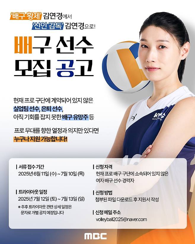 그에 따라 MBC는 지난 6월 11일부터 공식 SNS를 통해 선수 모집 공고를 내고 신청서를 받고 있다. 프로배구 V리그를 주관하는 한국배구연맹(KOVO)도 공식 SNS에 같은 공고문을 올리며 지원 사격을 했다.