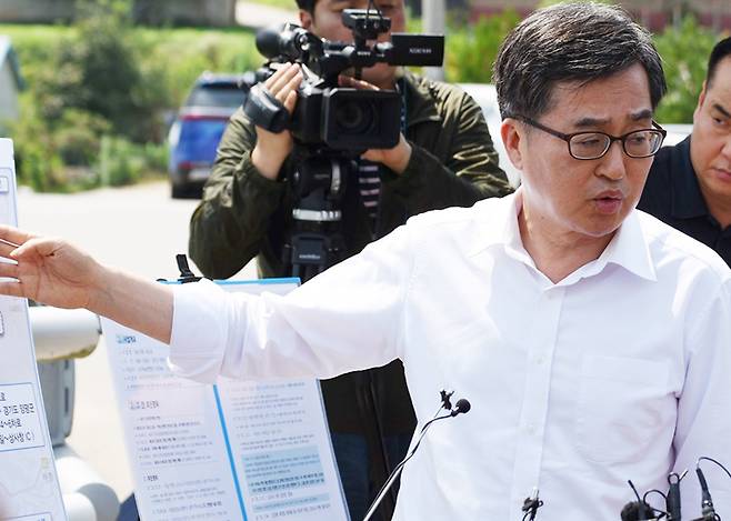 김동연 지사는 이날 현장 기자회견에서 서울~양평 고속도로 노선 변경과 관련된 김건희 일가 특혜 의혹에 대해 강도 높은 비판과 함께 철저한 진상 규명을 촉구했다.