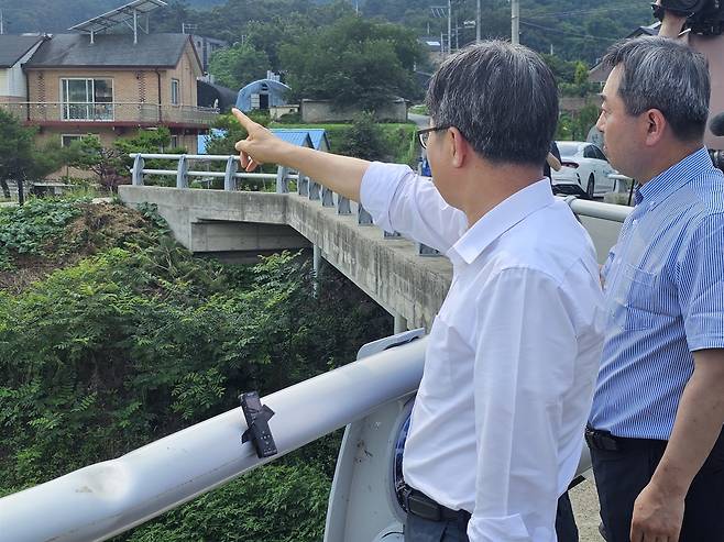 | ▲ 김동연 경기도지사가 8일 서울~양평 고속도로 원안 종점지인 양평군 양서면 청계리 54-1을 전격 방문해, 고속도로 노선 변경과 관련된 특혜 의혹에 대해 강도 높은 비판과 함께 철저한 진상 규명을 촉구했다. |