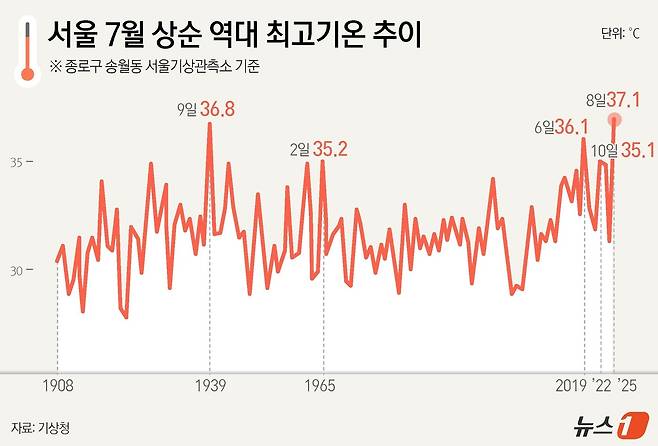 화요일인 8일, 서울 낮 기온이 37도를 넘기며 7월 상순(1~10일) 기온으로는 1907년 기상 관측이래 가장 높은 상태다.