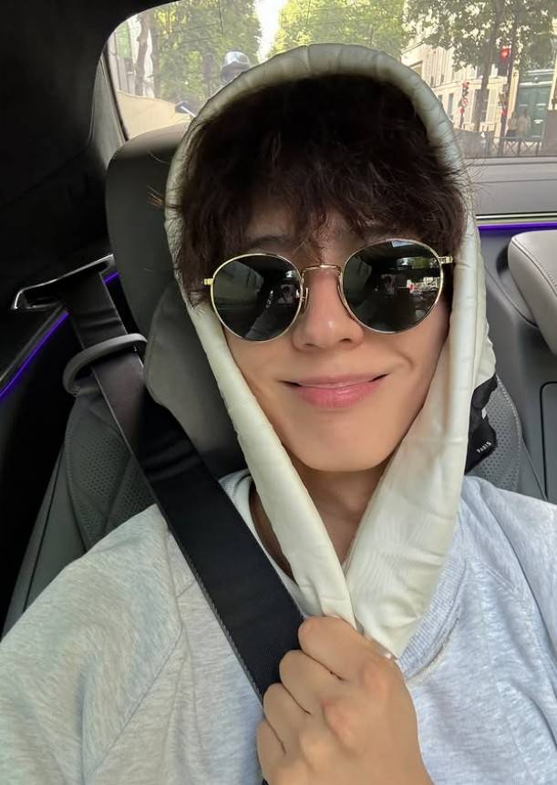 이동 중인 차 안 셀카에서는 맨투맨과 선글라스를 매치해 편안한 무드를 자아냈다. 아이보리 스카프를 접어 모자를 만들고, 옅은 골드 테두리의 선글라스로 무심한 듯한 스타일을 완성했다.