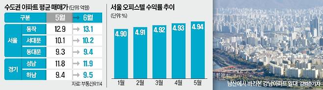 서울 오피스텔 수익률은 올 1월 4.90%를 기록한 이후 5개월 연속 증가세다. 전세 사기 이후 ‘전세의 월세화’ 현상으로 월세가 가파르게 올라서다. 윤수민 농협은행 부동산전문위원은 “서울 업무지구 접근성이 좋은 지역이 새 오피스텔 선호도가 높다”며 “금리 인하 기대로 월세 수익률은 더 높아질 것”으로 내다봤다.