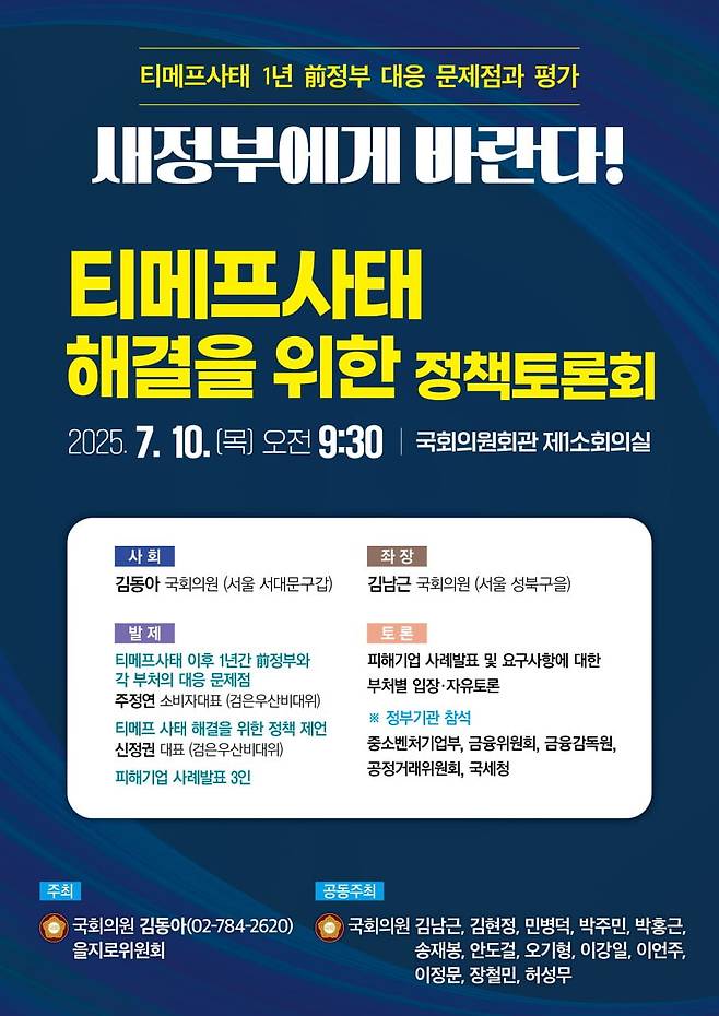 을지로위원회 소속 김동아 의원은 '새 정부에 바란다! 티메프사태 해결을 위한 정책토론회'를 오는 10일 국회 의원회관 제1소회의실에서 개최한다고 8일 발표했다. '티메프큐텐피해자연합' '검은우산비대상대책위원회' 등 피해 기업인과 소비자 150여 명이 참석할 예정이다. 김남근·김현정·민병덕·박주민 등 을지로위원회 소속 의원들과 중소벤처기업부·금융위원회·공정거래위원회 등 정부 기관 관계자들도 참여한다.