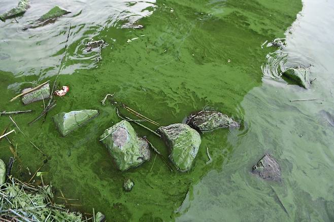 | ▲ 화원유원지에 창궐한 녹조. 바윗돌은 녹조가 말라붙어 푸른색을 띠고 있었다. |