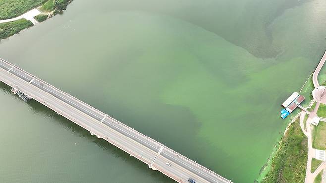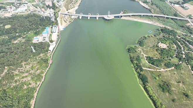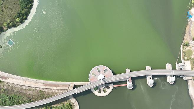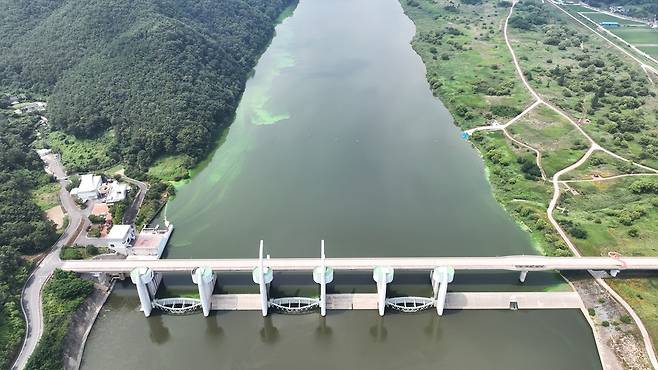 | ▲ 합천창녕보에 녹조가 번져가고 있다. |