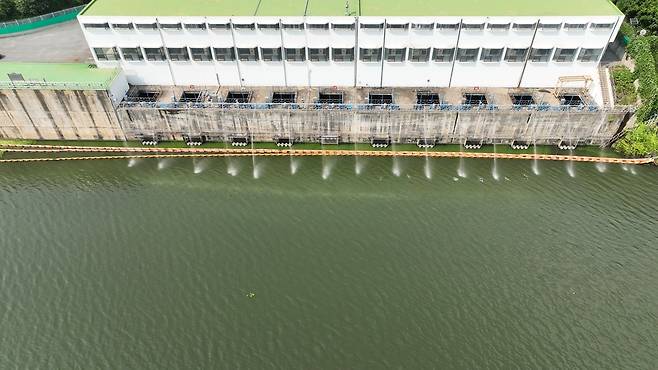 | ▲ 대구 수돗물의 원수를 취수하는 매곡취수장 취수구 앞 분무기가 고압의 물을 분사해 몰려드는 녹조를 밀어내고 있다. |