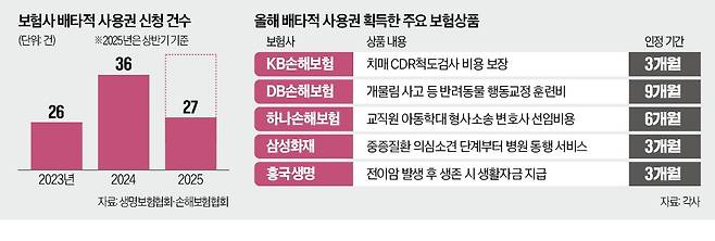 보험사의 배타적 사용권 신청 건수는 2023년 26건, 지난해 36건 등으로 증가하는 추세다. 올해 말 신청 건수까지 합하면 역대 최대를 기록할 전망이다.