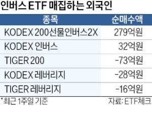 8일 ETF체크에 따르면 지난 1주일간(7월 1~7일) 외국인 투자자가 가장 많이 매수한 국내 ETF는 ‘KODEX 200선물인버스2X’였다. 이 기간 총 279억원어치를 순매수했다. 이 ETF는 코스피200 선물지수 하락분의 두 배만큼 오르도록 설계된 이른바 ‘곱버스’ 상품이다. 또 다른 인버스 ETF인 ‘KODEX 인버스’도 32억원어치 사들였다.