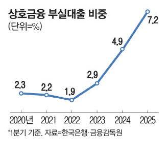 관련 통계가 집계되기 시작한 2011년 이후 분기 기준 사상 최고치다. 상호금융 부실대출 비중은 코로나19 국면인 2020~2023년에도 평균 2%대 중반 수준을 보였지만 지난해 5~6%를 넘더니 올 들어 처음으로 7%를 넘어섰다.