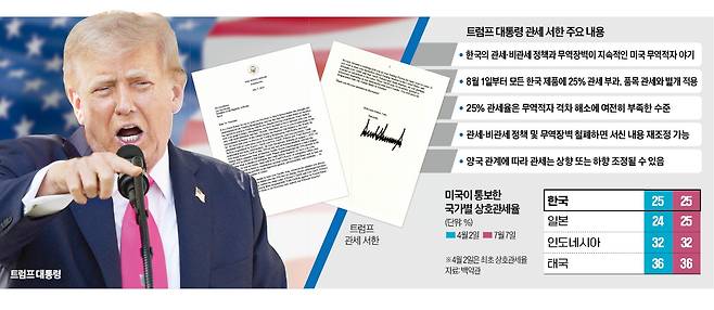 도널드 트럼프 미국 대통령이 8일 '한국산 제품에 다음달 1일부터 25%의 상호관세를 부과하겠다'고 명시한 서한을 보내자 우리 통상당국은 "사실상 상호관세 부과 유예가 3주간 연장된 것"이라며 "남은 기간 상호 호혜적인 결과를 도출하기 위해 협상에 박차를 가할 것"이라고 밝혔다.