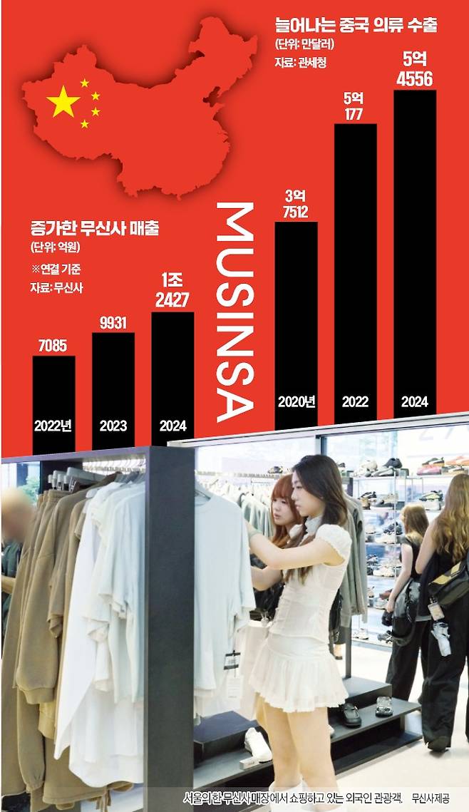 중국에서 K패션의 인기는 수치로도 나타난다. 지난 5월 무신사가 국내 11개 무신사 스탠다드 매장의 외국인 매출을 분석한 결과 중국 국적이 18.4%로 가장 높았다. 대만(15.7%) 미국(12.4%)이 그 뒤를 이었다. K패션을 직구하는 중국 소비자도 늘고 있다. 관세청에 따르면 대중 의류 수출액은 2020년 3억7512만달러에서 지난해 5억4556만달러로 45.4% 증가했다.
