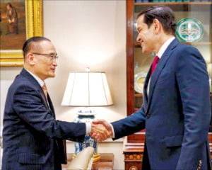 미국을 방문 중인 위성락 국가안보실장(왼쪽)이 7일(현지시간) 워싱턴DC에서 마코 루비오 미국 국무장관 겸 국가안보보좌관(오른쪽)을 만나 한·미 양국 현안을 논의했다.