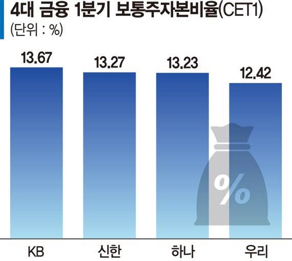 현재 금융당국은 국제결제은행(BIS) 규제에 따라 금융지주의 보통주자본비율(CET1)을 12% 이상 유지하도록 권고하고 있다. 지난 1·4분기 기준 4대 금융의 CET1은 △KB금융 13.67% △신한금융 13.27% △하나금융 13.23% △우리금융 12.42% 수준이다.