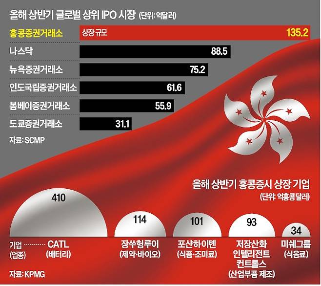 올해 상반기 홍콩증시가 글로벌 기업공개(IPO) 시장에서 두각을 나타냈다. 지정학적 긴장 등 불확실성으로 주춤하던 홍콩이 중국 기업의 대규모 상장 행렬에 힘입어 국제 금융허브의 위상을 회복하고 있다는 평가가 나온다.