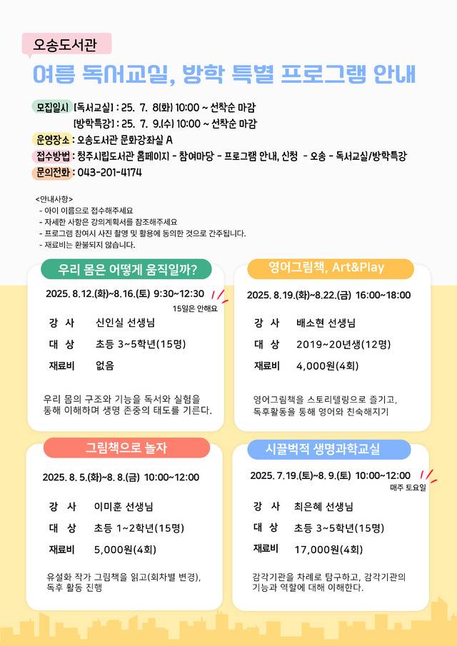 청주오송도서관 권역별 7개관(오송·서원·흥덕·신율봉·강내·옥산·가로수)은 유아 및 초등학생 329명을 대상으로 사회, 역사, 음악 등 25개의 다양한 프로그램을 선보인다.