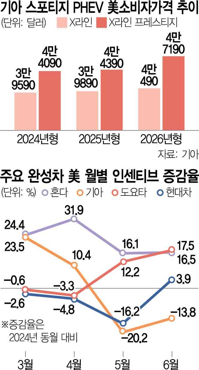 8일 완성차 업계에 따르면 기아는 이달 말 미국 출시 예정인 2026년형 스포티지 PHEV 모델의 권장소비자가격(MSRP)을 X라인 트림 4만 490달러(약 5531만 원), X라인 프레스티지 트림 4만 7190달러(약 6448만 원)로 각각 책정했다. 이전 모델과 비교해 600달러(약 80만 원), 2800달러(약 380만 원)씩 올랐는데 인상률로 따지면 각각 1.5%, 6.3%에 달한다.