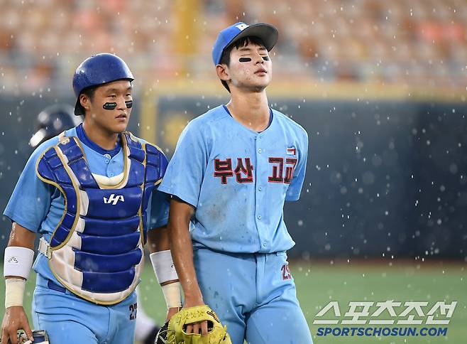 8일 서울 목동구장에서 열린 제80회 청룡기 고교야구선수권 대회 및 주말리그 왕중왕전 서울고와 부산고의 8강전. 8회말 2사 만루 갑작스러운 폭우로 경기가 중단되자 부산고 투수 하현승이 아쉬워하고 있다. 목동=정재근 기자 cjg@sportschosun.com/2025.7.8/