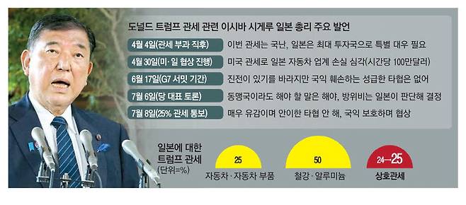 도널드 트럼프 미국 대통령이 일본에 25%의 상호관세 부과 방침을 발표한 것과 관련해 이시바 시게루 일본 총리가 "진심으로 유감"이라는 반응을 내놓았다.
