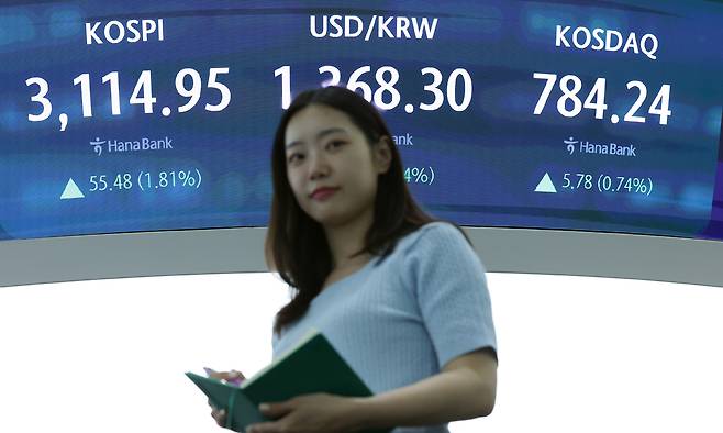 | 한숨 돌린 증시 도널드 트럼프 미국 대통령이 8월1일부터 모든 한국산 제품에 25%의 상호관세를 부과하겠다고 통보한 8일 오후 서울 중구 하나은행 딜링룸 전광판에 코스피 종가와 환율이 표시돼 있다. 뉴스1 |