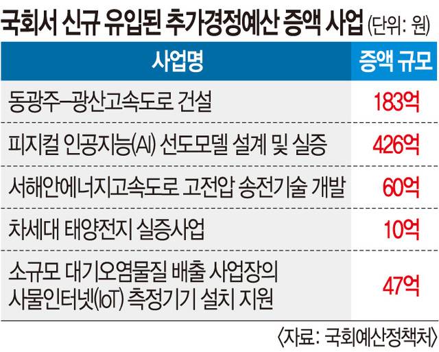 쪽지 예산을 의심케 하는 사례는 SOC 관련 예산 외에도 적지 않다. 국회는 심의 과정에서 신산업 분야 투자 촉진 명목으로 1000억원을 증액했다. 당초 정부안에 없던 피지컬 AI 선도모델 설계 및 실증 예산이 426억원 증액됐다. 전북도가 229억원, 경남도가 197억원을 가져가는 것으로 분배됐다.