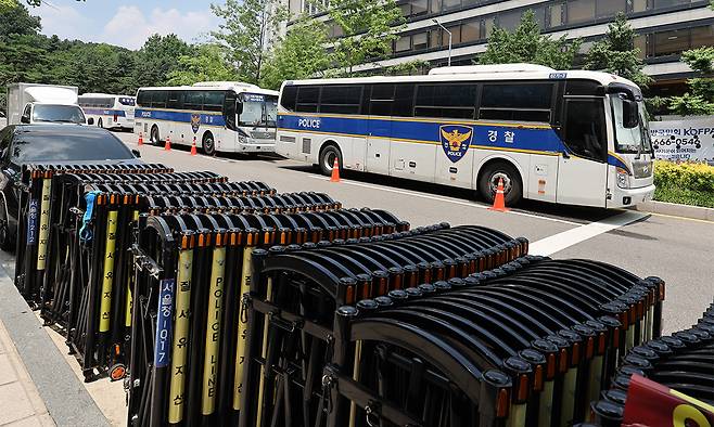 | 폭력사태 대비… 법원 앞 기동대 등 2000여명 투입 윤석열 전 대통령의 구속 전 피의자 심문(영장실질심사)을 하루 앞둔 8일 서울 서초구 서울중앙지법 앞에 경찰버스가 늘어서 있다. 경찰은 9일 찬반단체 대립에 대비해 서울중앙지법 주변에 경찰 기동대 30여개 부대, 2000여명을 투입한다면서 불법 폭력행위에 대해서는 엄정 사법조치하겠다고 경고했다.연합뉴스 |