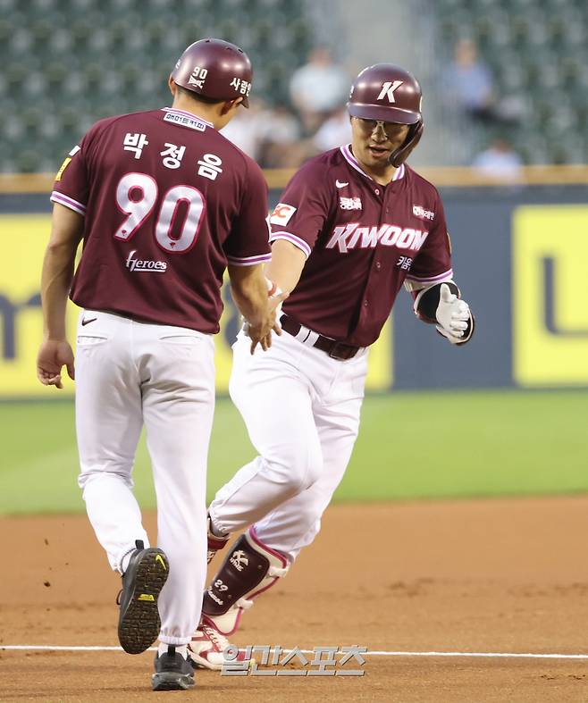8일 오후 서울 잠실야구장에서 열린 2025 KBO리그 프로야구 LG트윈스와 키움히어로즈의 경기에서 1회초 무사 1루 임지열이 투런홈런를 치고 베이스를 돌고 있다.