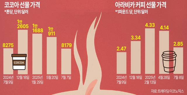 8일 시장분석업체 트레이딩이코노믹스에 따르면 코코아와 커피 원두 선물 가격(7일 기준)은 한 달 전 대비 각각 19.87%, 21.01% 하락한 것으로 집계됐다. 먼저 코코아 가격은 지난해 하반기부터 폭등했다가 올해 초 들어서는 하락세를 보였다. 이후 5월까지 다시 가격 상승세가 지속되다 내림세로 돌아섰다.