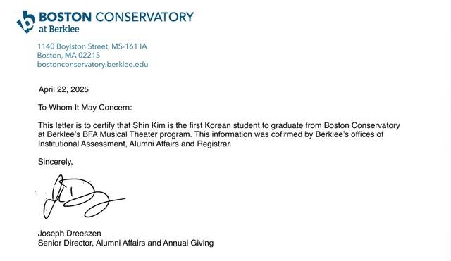 김 씨는 학교 측에서 받은 레터(사진)를 내밀었다. 레터에는 이 학교 총동문 & 기부 사무 책임자가 김 씨가 ‘버클리 음대의 뮤지컬을 전공한 최초의 한국인’이라는 사실을 증명하는 내용이 담겨 있었다.